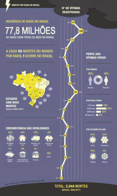 Entre 2011 e 2017, caíram no Brasil quase 78 milhões de raios, segundo levantamento do Instituto Nacional de Pesquisas Espaciais (Inpe). Muitos deles, infelizmente, foram fatais – para se ter ideia, a cada 50 mortes por raio no mundo, uma ocorre por aqui.